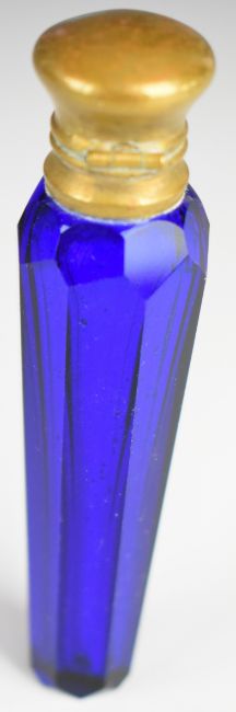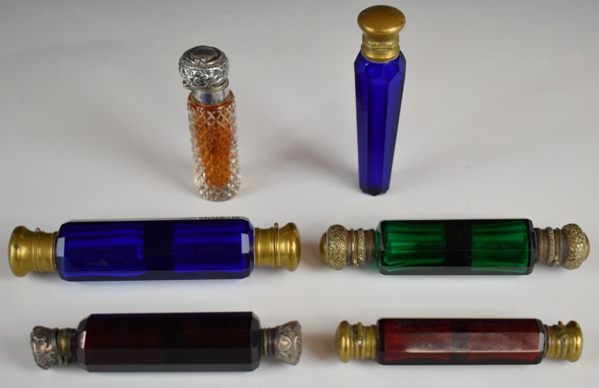 Six scent / perfume bottles, four double ended and a hallmarked silver mounted cut glass example, longest 13.5cm