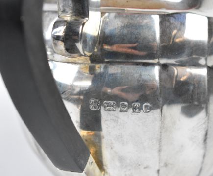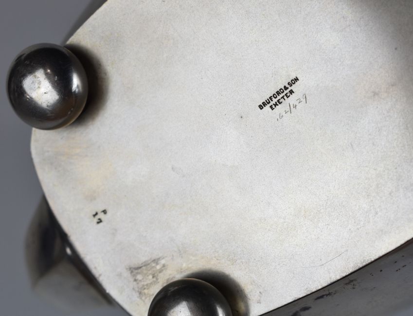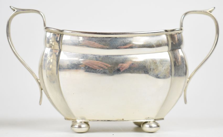 George V hallmarked silver three piece tea set of bulbous square form with incuse corners and raised on four ball feet, London 1934, maker William Bruford & Son Ltd and also stamped Bruford Exeter to base of each piece, length of teapot 27cm, weight of all three pieces 819g all in