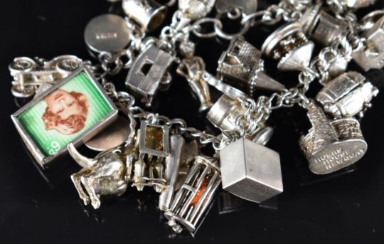 A silver charm bracelet with thirty charms including monkey in cage, whistle, St Christopher, car, barrel opening to reveal drunk man, kangaroo with moving tail to reveal a joey, etc and another silver charm bracelet with one Links of London charm,128g