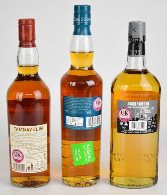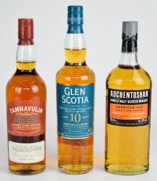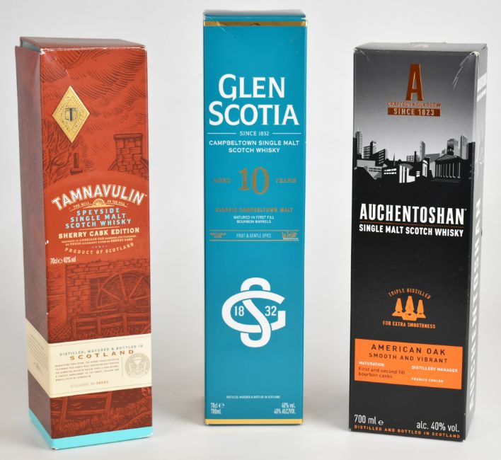 Three bottles of single malt Scotch Whisky comprising Glen Scotia 10 Year Old, Tamnavulin Sherry Cask Edition and Auchentoshan American Oak, all 40% vol, 70cl and in original presentation boxes. PLEASE NOTE ALL ALCOHOL & TOBACCO ITEMS ARE SUBJECT TO OVER 18 CHECK ON COLLECTION OR DELIVERY