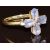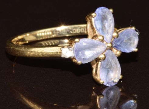 A 9ct gold ring set with four pear cut tanzanites and a zircon, with certificate, 2g, size N