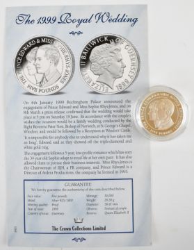 Six Royal Mint silver proof coins comprising 1999 Guernsey Prince Edward and Miss Sophie Rhys-Jones £5 coin and five 15.98g coins, total weight of 0.925 silver 108.18g, all with certificates,