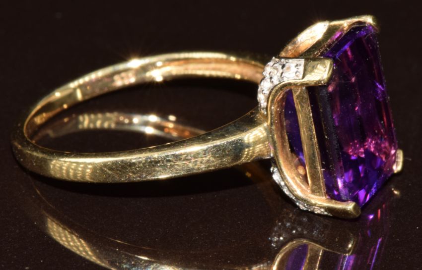 A 9k gold ring set with an octagonal cut Siberian amethyst of approximately 4.2ct and white sapphires, with certificate, 3.4g, size N