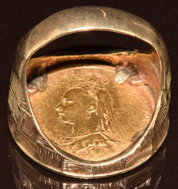 A 9ct gold ring set with an 1892 gold full sovereign with Melbourne Mint mark, 17.1g, size R
