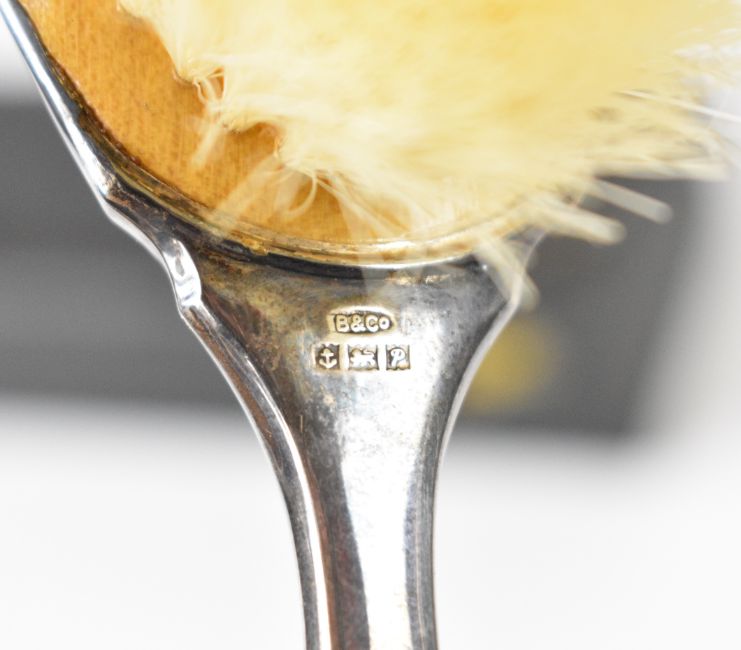 Cased hallmarked silver brush and comb set, length of main brush 18.5cm, Birmingham 1964/6, maker W I Broadway & Co, two hallmarked silver napkin rings and a bangle marked sterling, weight excluding brush and comb 57g