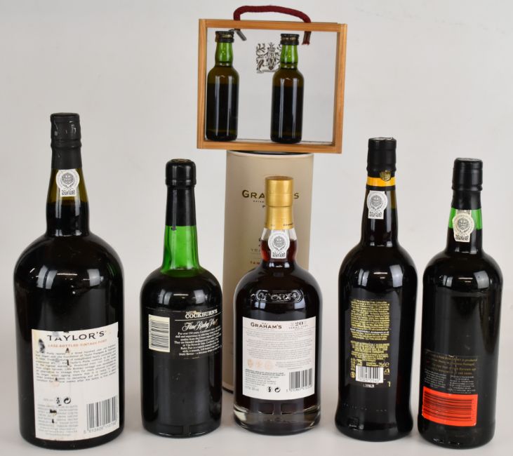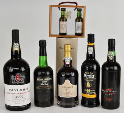 Five bottles of Port comprising Taylor's 2009 1.5L, Graham's 75cl, Armilar 75cl, Fletcher's 75cl and Cockburn's 70cl, together with two miniatures, all 20% vol. PLEASE NOTE ALL ALCOHOL & TOBACCO ITEMS ARE SUBJECT TO OVER 18 CHECK ON COLLECTION OR DELIVERY