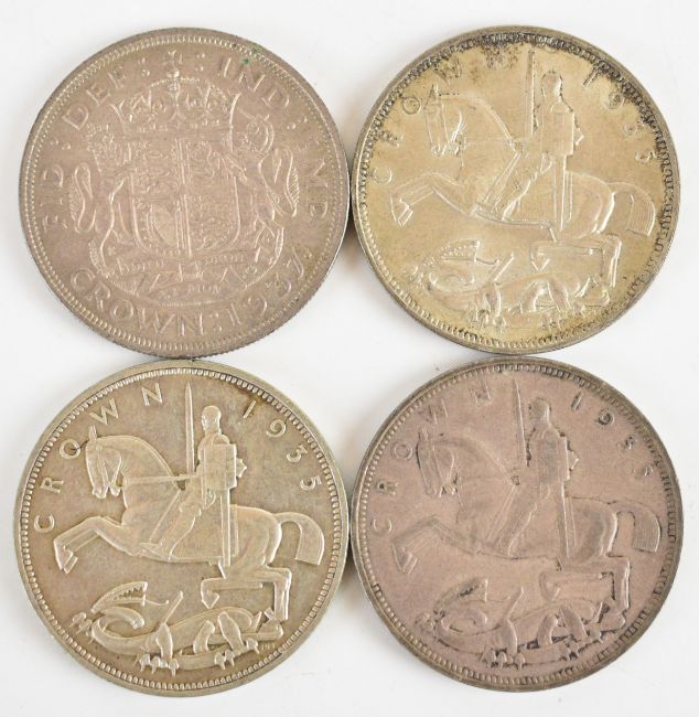 Four George V and George VI crowns comprising three 1935 rocking horse examples and a 1937 example, weight 113g