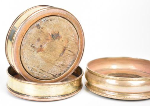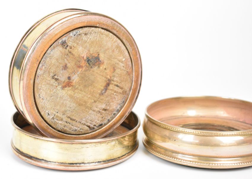 Elizabeth II feature hallmarked silver wine bottle coaster, London 1995, maker M C Hersey & Son Ltd, diameter 13cm, together with a pair of Sheffield plated wine bottle coasters