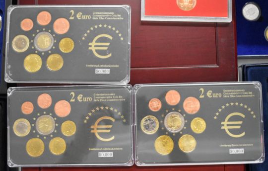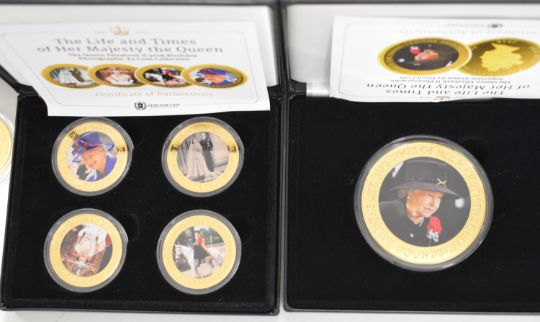 Large collection of cased and loose collectable coins, mainly commemorative, many with enamelled portraits, include Queen Elizabeth II Five Crown Coin, 1953 Coronation Year set, 1981 proof set, Historic Coins of Great Britain, Golden Edition coins, Greatest Britons, four 2 Euro packs etc, some incomplete sets
