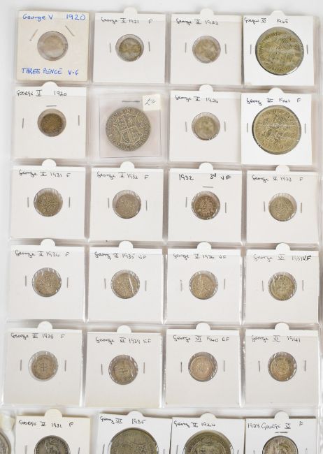 Approximately 860g of pre-1947 British silver coinage comprising George V and George VI from half crown down to 3d, some graded in cards