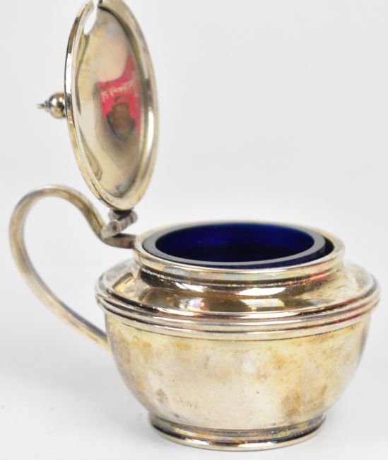 Elizabeth II hallmarked silver three piece cruet set comprising salt, pepper, mustard and silver plated spoon, Birmingham 1972, maker A T Cannon Ltd, in original fitted case width 22cm, 120g excluding liner and spoon