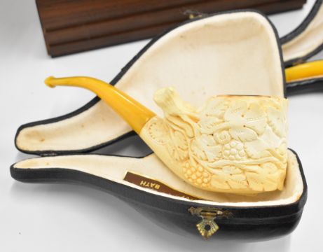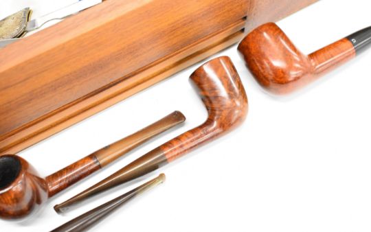 Savinelli humidor, cased and loose pipes including Meerschaum, Petersons, Duncan, Londoner Barling 411, Orlite De Luxe, W. Payne, Finlays Laureate, cased Tranter hallmarked silver pipe tamper / knife etc