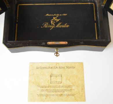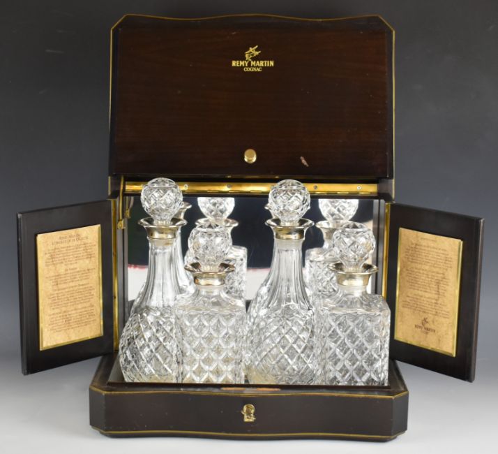 Remy Martin cognac safe with double hinged lid, mirrored interior and hinged side doors, containing four glass decanters, 32 x 39 x 26cm
