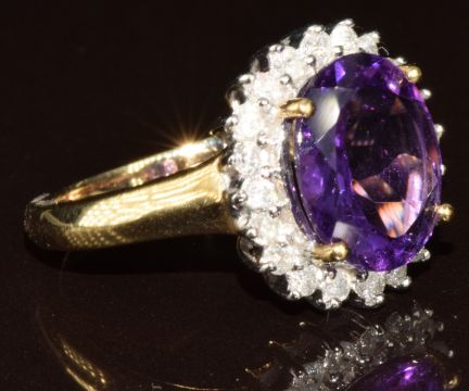 A 9ct gold ring set with an oval cut amethyst surrounded by diamonds, the total diamond weight approximately 0.5ct, 4.8g, size N