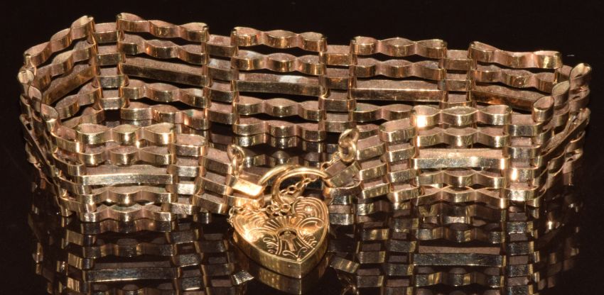 A 9ct gold gate bracelet with heart padlock clasp, 12.1g, 18cm