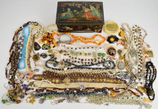 A collection of jewellery including 9ct gold cufflinks (3g, Birmingham 1917), necklaces including freshwater pearl and hematite, French jet, beaded and amber, diamanté brooch, 9ct gold cufflinks (3g, Birmingham 1917), 9ct gold cross (0.8g), silver earrings, silver brooches, Sphinx brooch, yellow metal locket filled with 'gold pieces', etc
