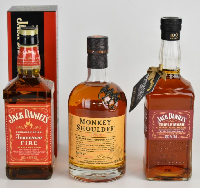 Eleven bottles of mixed spirits and liqueurs comprising Jack Daniel's Triple Mash, Monkey Shoulder, Bearface Canadian Whisky, Roe & Coe, Haig Club, Jack Daniel's Fire, Jimador, Bacardi Spiced Rum, Bell's, Chivas Regal and Johnnie Walker Black Label, all 70cl and 1L bottles. PLEASE NOTE ALL ALCOHOL & TOBACCO ITEMS ARE SUBJECT TO OVER 18 CHECK ON COLLECTION OR DELIVERY