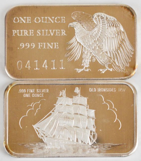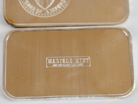 Two 1oz fine silver bars or ingots, one commemorating 200 years of US independence the other Madison Mint Old Ironsides