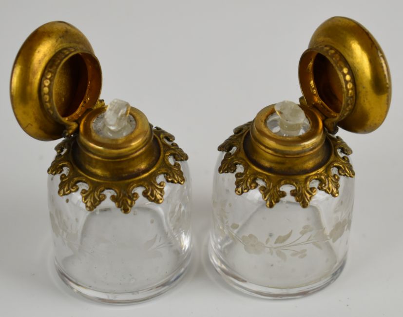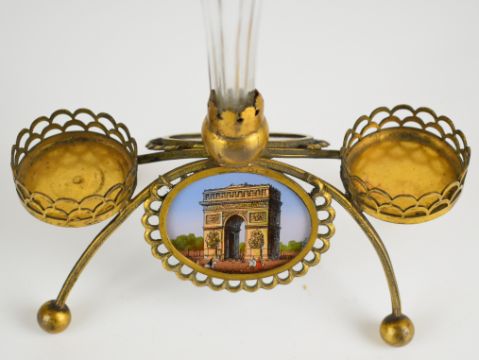 Two scent / perfume bottle etui / epergnes in the Sèvres style, the epergne stand decorated with classical buildings, tallest 19cm