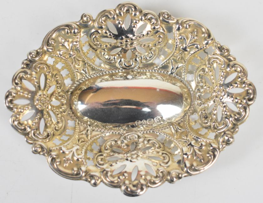 Edward VII hallmarked silver bon bon dish with embossed decoration, Chester 1902, maker James Deakin & Sons, length 10cm, two hallmarked silver napkin rings, hallmarked silver salt and a hallmarked silver lidded cut glass dressing table pot, total weighable silver 86g