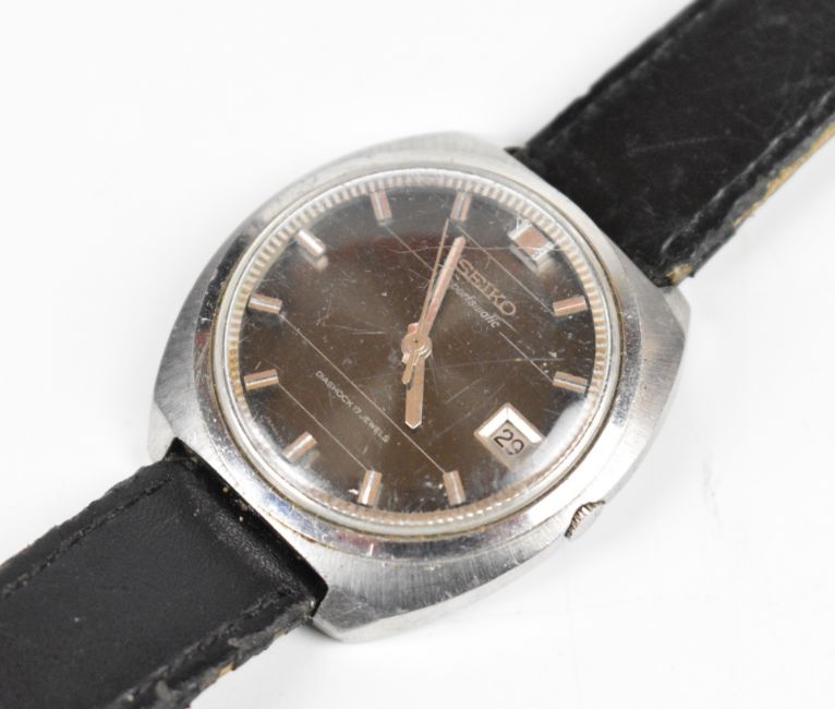 Two Seiko Sportsmatic gentleman's automatic wristwatches ref. 7625-8060 with date aperture, steel hands and hour markers, silver dial, stainless steel case and signed 17 jewel movement, case diameter 37mm, serial number 5701700 and ref. 7625-8200 with date aperture, steel hands and hour markers, grey dial, stainless steel case and signed 17 jewel movement, on black leather strap, case diameter 38mm, serial number 6401703.