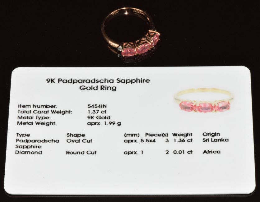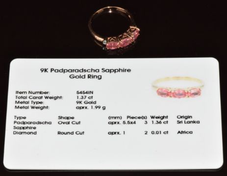 A 9k gold ring set with three oval cut Padparadscha sapphires, the total carat weight 1.3ct, and two diamonds, with certificate, 2.2g, size M