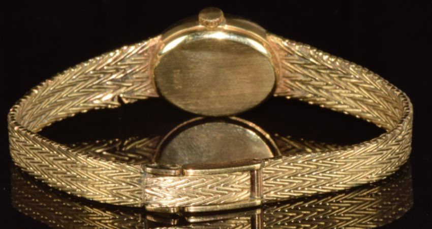 Rotary 9ct gold ladies wristwatch with two-tone hands and baton hour markers, gold dial and quartz movement, on integral 9ct gold bracelet, case diameter 18mm, 23.3g.