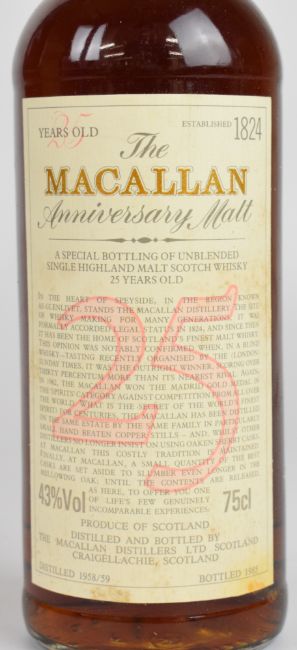 The Macallan Anniversary 25 Year Old Speyside Single Malt Scotch Whisky, distilled 1958/59, bottled 1985, 43% vol, 75cl, in wooden case. PLEASE NOTE ALL ALCOHOL & TOBACCO ITEMS ARE SUBJECT TO OVER 18 CHECK ON COLLECTION OR DELIVERY