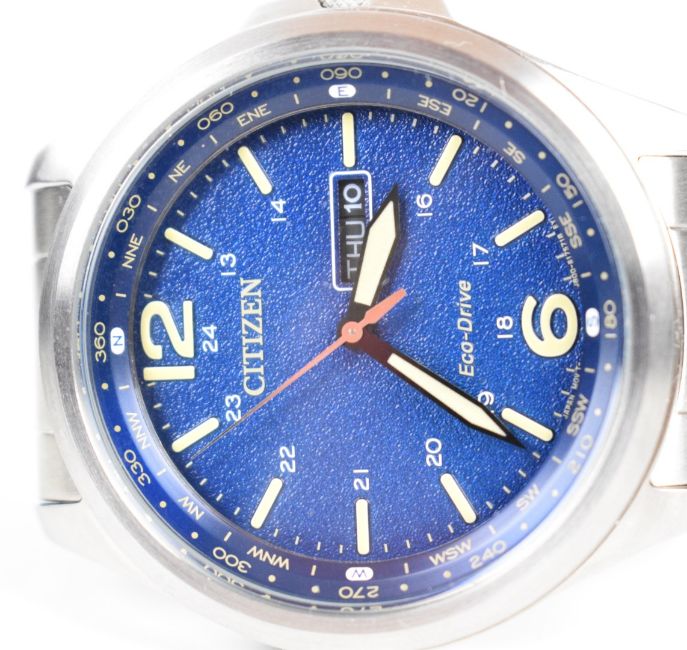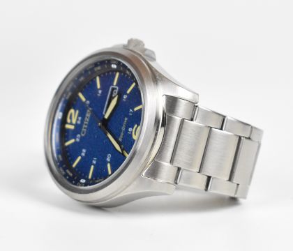 Citizen Eco-Drive gentleman's wristwatch ref. J800-S128226 with day and date aperture, luminous hands and hour markers, blue dial, stainless steel case and solar powered movement, on stainless steel bracelet, case diameter 43mm, serial number 462050274, in original box with spare bracelet links, guarantee and outer card box.
