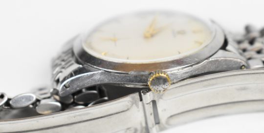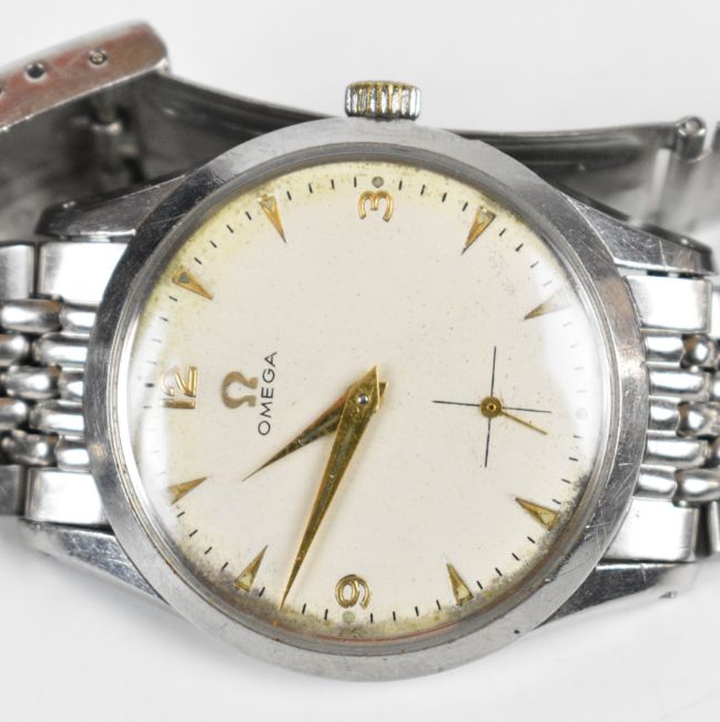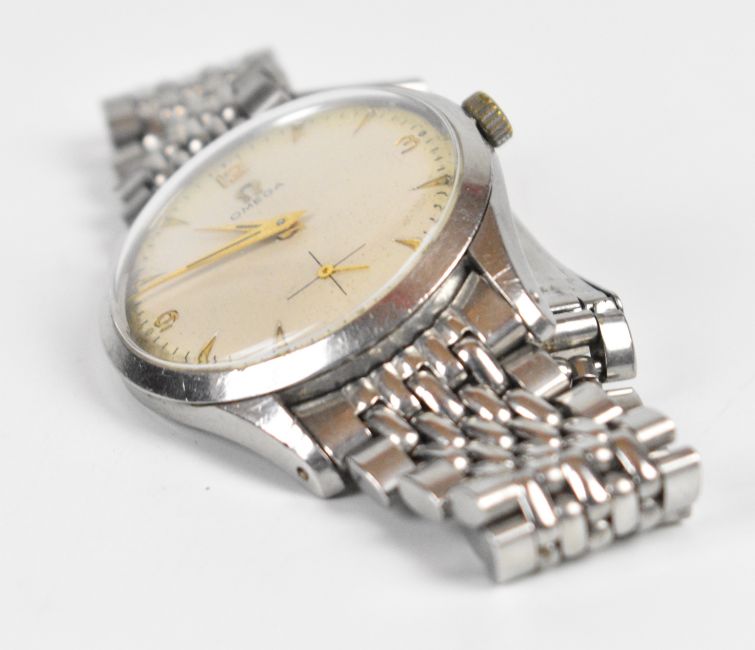Omega gentleman's wristwatch with subsidiary seconds dial, gold hands and hour markers, silver dial, stainless steel case and mechanical movement, on stainless steel bracelet, case diameter 35mm.