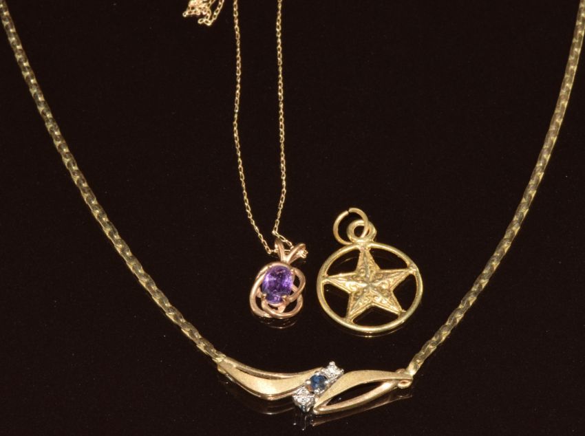 A 9ct gold necklace set with a sapphire and diamonds, 9ct gold pendant set with an amethyst, on 9ct gold chain (6.2g) and a 14k gold pendant (1.1g)