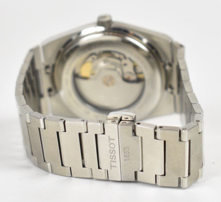 Tissot PRX Powermatic 80 gentleman's automatic wristwatch ref. T137407A with date aperture, luminous steel hands and hour markers, graduated blue dial, stainless steel case, clear exhibition case back and signed 23 jewel movement, on stainless steel bracelet, case diameter 40mm, serial number NRT B7T CRB, in original box with spare bracelet links, hang tag and related paperwork.