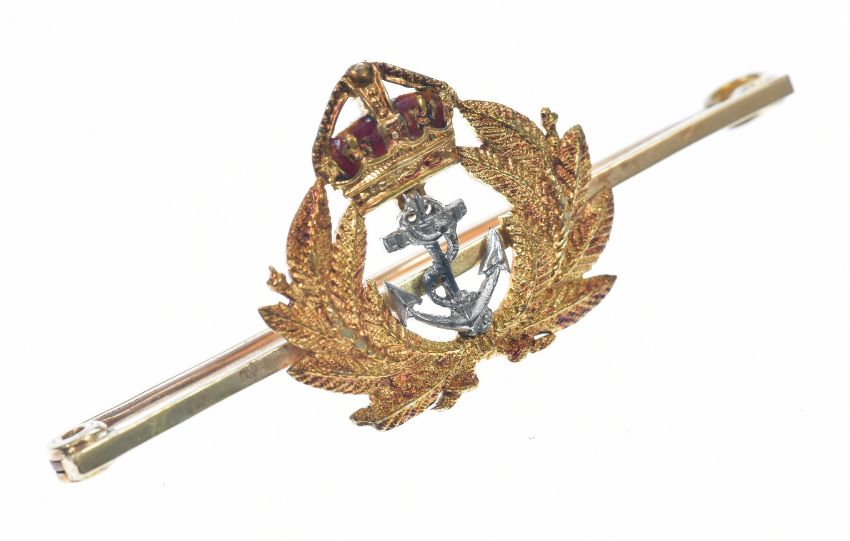 A 14ct gold Royal Navy sweetheart brooch by Charles Packer & Co, in original box, 4.8g, 4.5cm