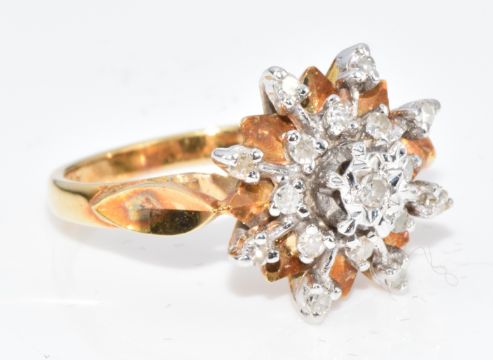 An 18ct gold ring set with diamonds in a snowflake cluster, 4.2g, size H/I
