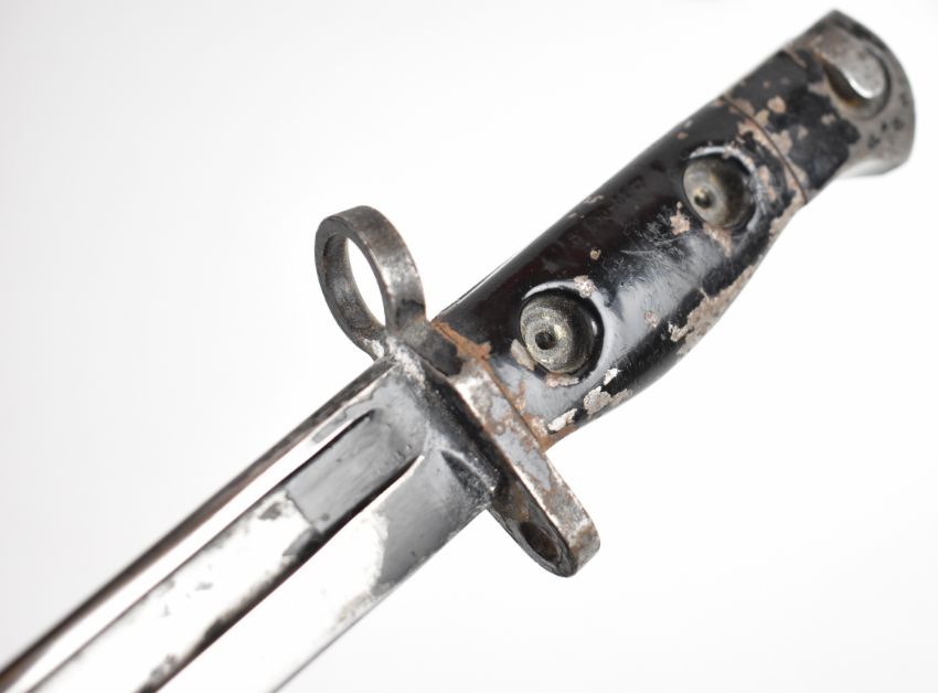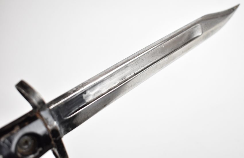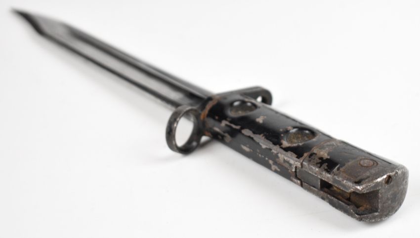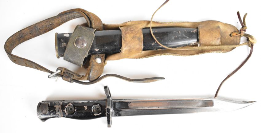British Cold War L1A3 bayonet with 20cm blade, the handle faintly stamped, in blackened scabbard, in potentially improvised leather frog, overall length 32.5cm. PLEASE NOTE: WE ARE NOT ABLE TO OFFER OUR USUAL POSTAGE SERVICE FOR THIS LOT