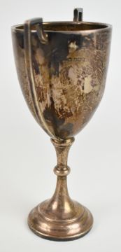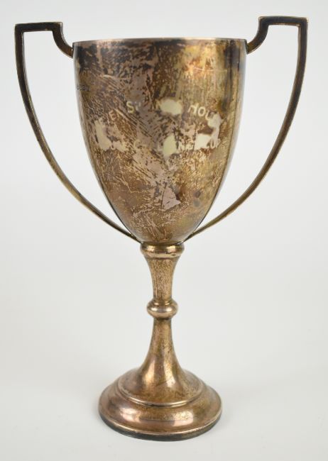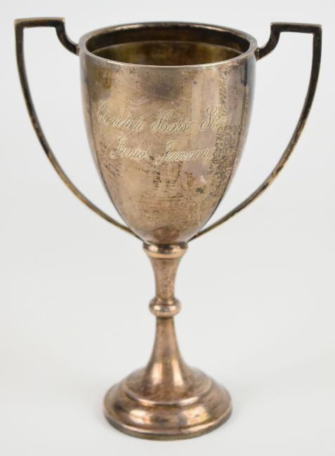 Elizabeth II hallmarked silver twin handled trophy cup with Clevelode Horse Show Junior Jumping engraving, Birmingham 1968, maker Woodalls, height 21cm, weight 247g