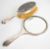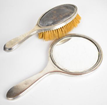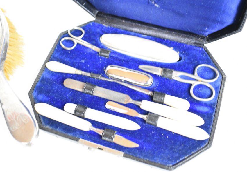 George V hallmarked silver dressing table set comprising hand mirror and three brushes, Birmingham 1923, maker Daniel Manufacturing Company, length of mirror 27cm, hallmarked silver topped cut glass dressing table bottle and a leather cased mother of pearl handled manicure set