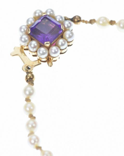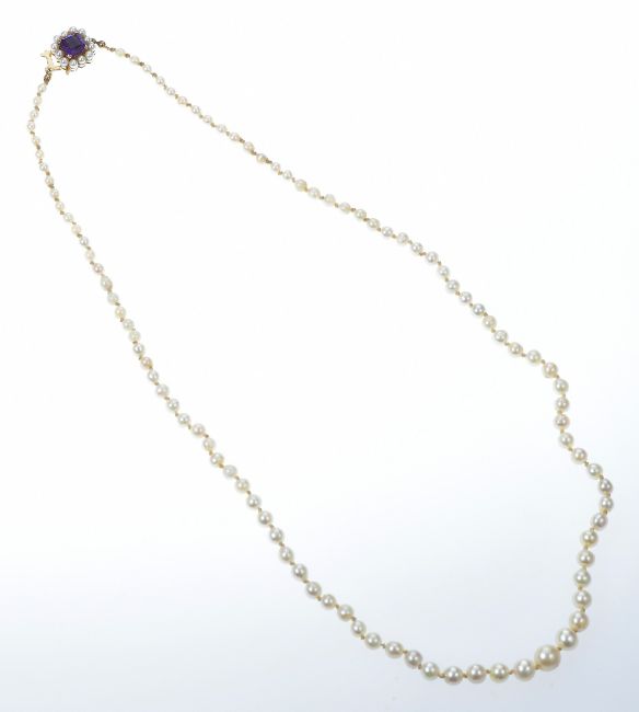 A single strand of graduated cultured pearls with 18k gold clasp set with an amethyst surrounded by pearls, 15.3g, 52cm