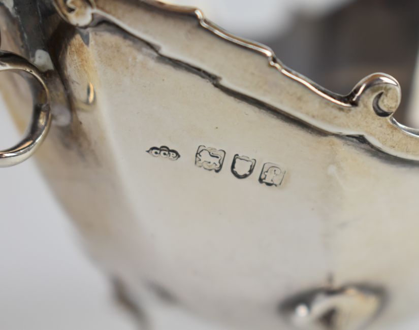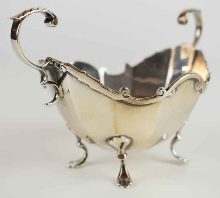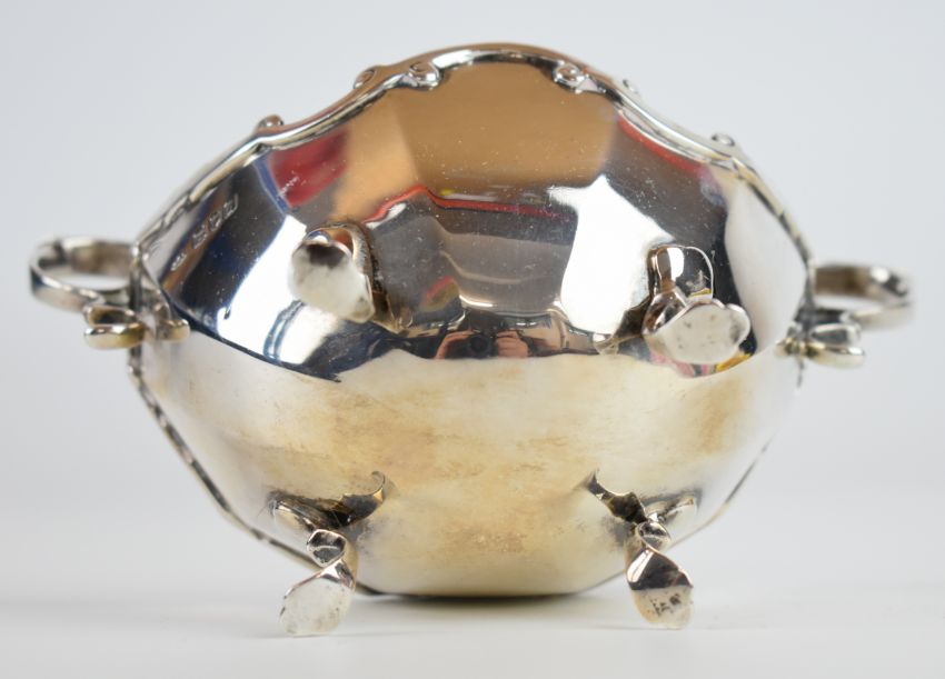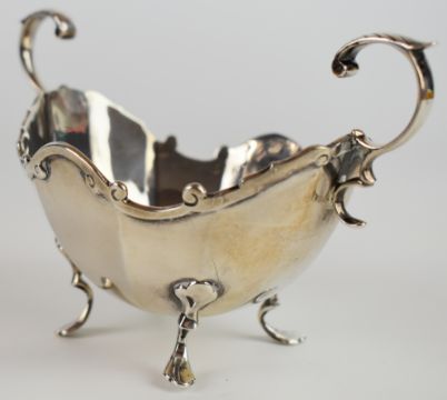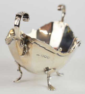 Victorian or Edward VII hallmarked silver twin handled sugar bowl, with faceted body, scroll handles and raised on four feet, London 1901, maker Sibray, Hall & Co Ltd, length 15cm, weight 136g