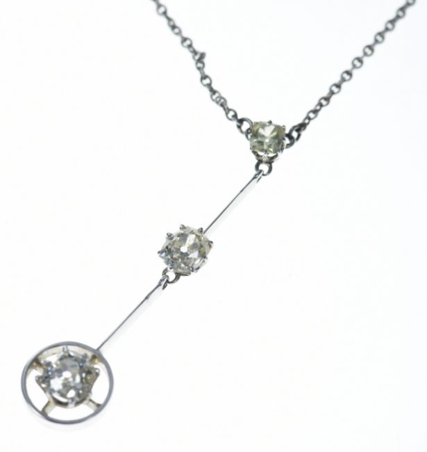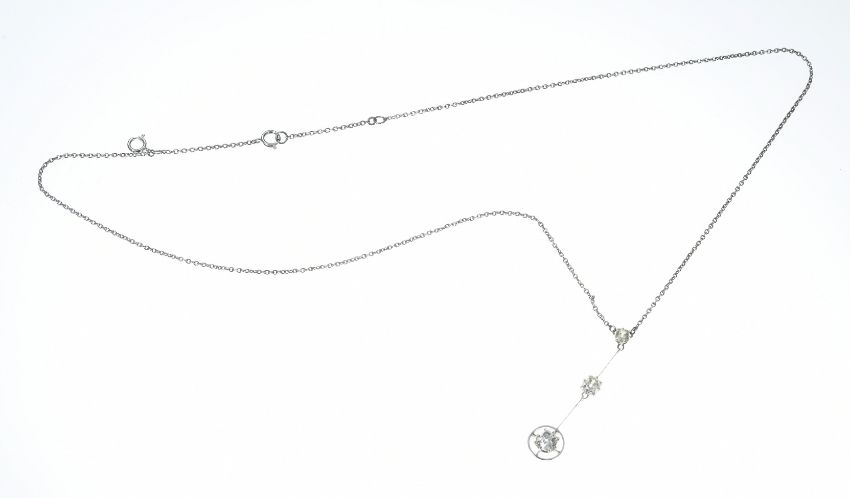 A white gold necklace set with two old cut diamonds of approximately 0.6ct & 0.4ct and a citrine, in antique box, 4.1g, 45cm. Tests as 18k white gold