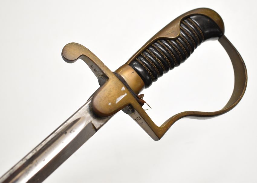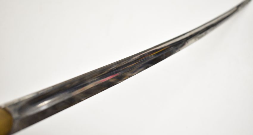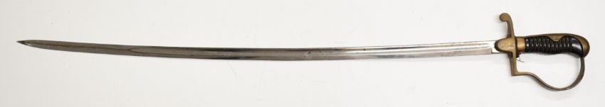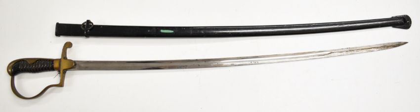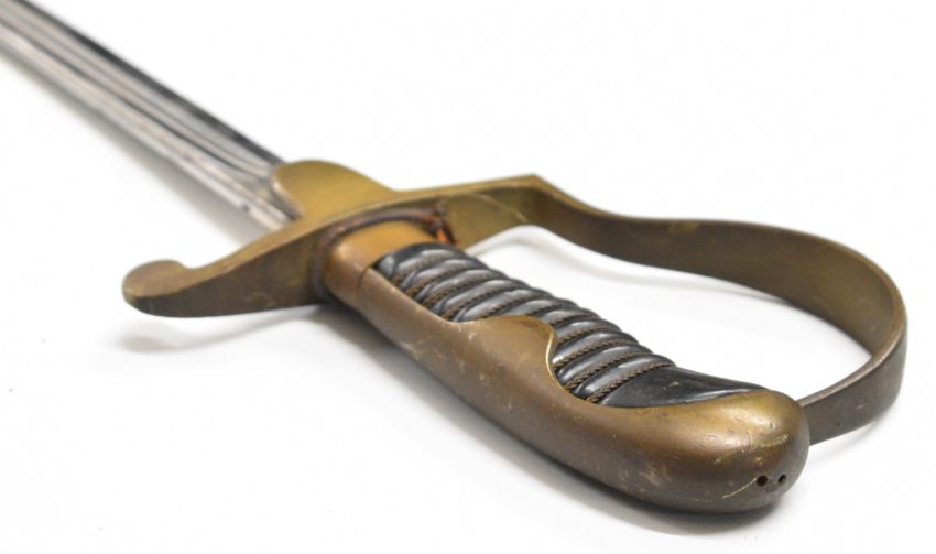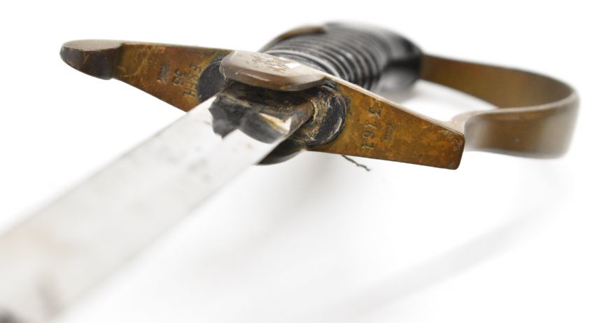 German WW2 Calvary NCO's Ordnance Issue sword with 80cm single edged single fullered blade, E.&F Horster, Solingen maker's mark to the ricasso, WaffenAmt marks and a '2' to the spines of the blade, brass gilt hilt, cross guard marked E&FH 38, 3161 and two further WaffenAmt marks, knuckle guard and wire bound moulded black celluloid grip, in blackened steel scabbard marked 1918 and matching E&FH 38, with single suspension loop, overall length 97cm. PLEASE NOTE: WE ARE NOT ABLE TO OFFER OUR USUAL POSTAGE SERVICE FOR THIS LOT