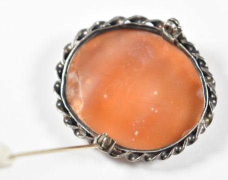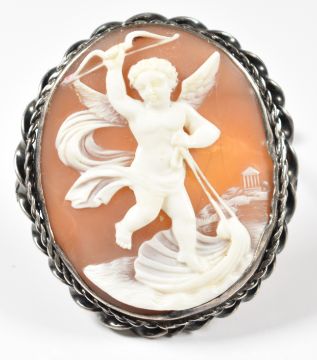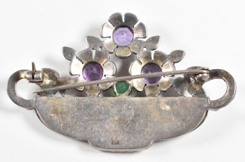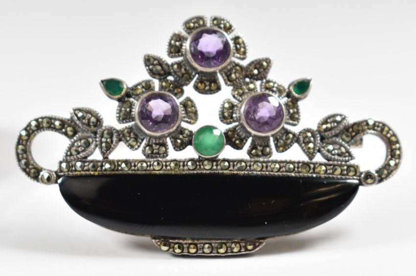Victorian silver brooch set with a cameo depicting Eros and a silver brooch in an Art Deco style set with marcasite, amethysts and green agate, 18g