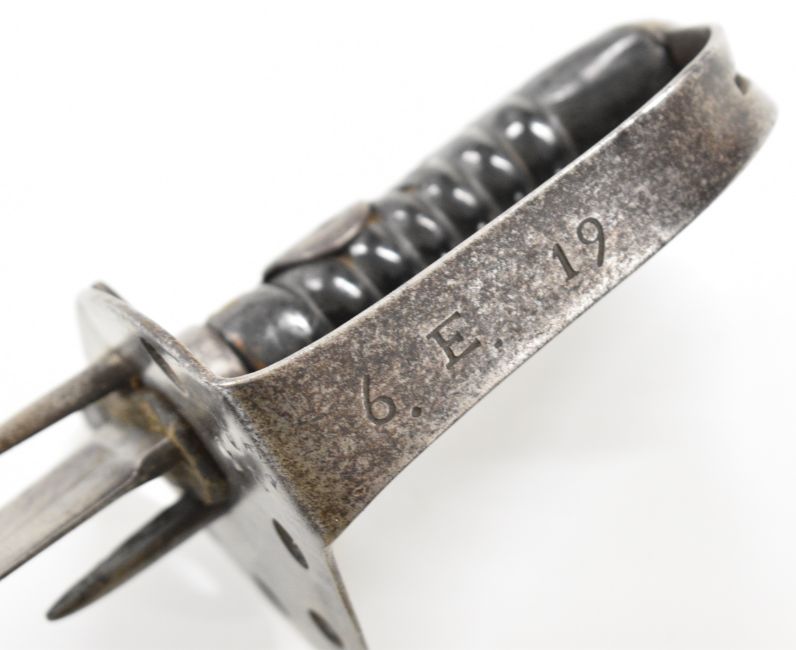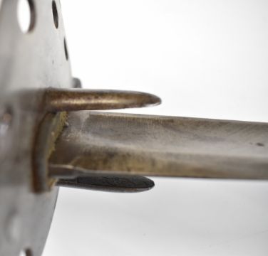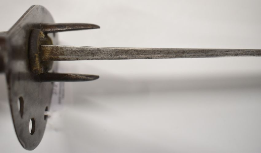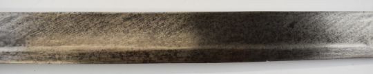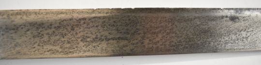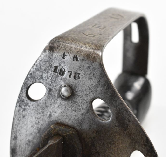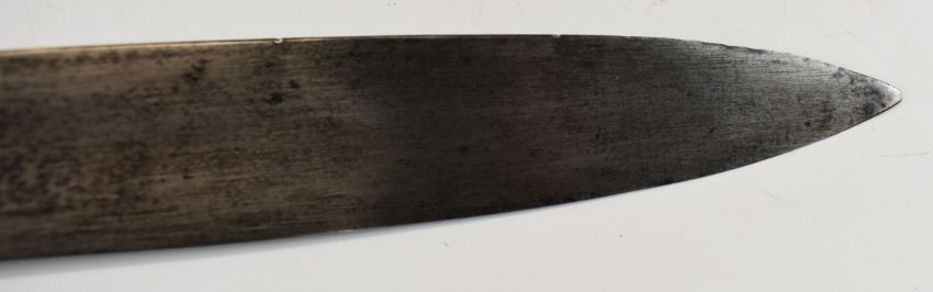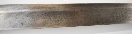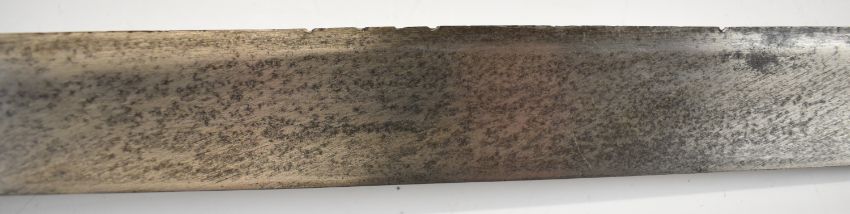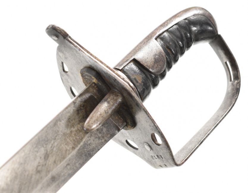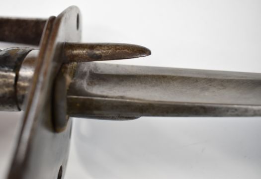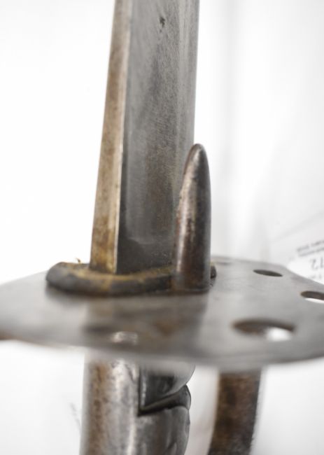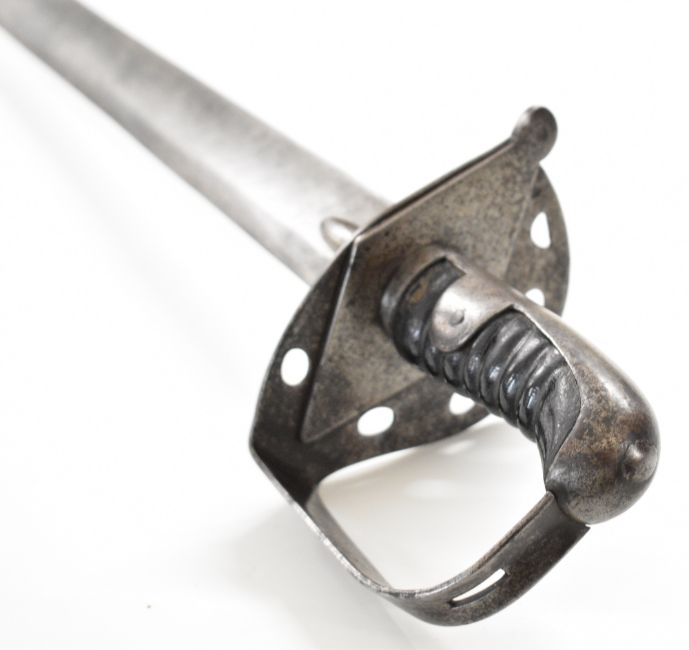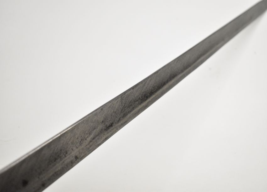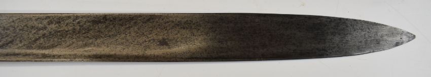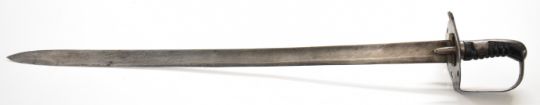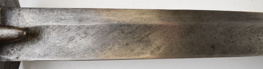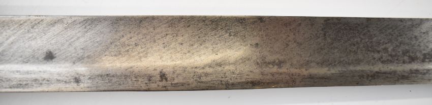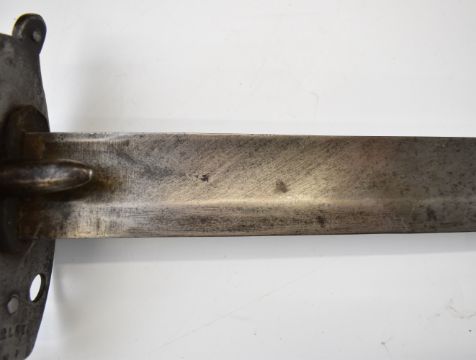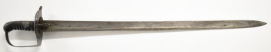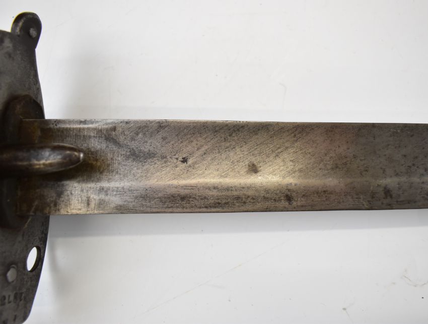 British Napoleonic era 1796 pattern Heavy Cavalry sword with 82cm blade, stamped 1873, FA and 6.E. 19 and V and 4 to hilt with potential approval stamp to ricasso, and black grips, overall length 95cm. PLEASE NOTE: WE ARE NOT ABLE TO OFFER OUR USUAL POSTAGE SERVICE FOR THIS LOT