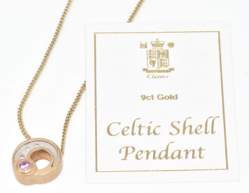 A 9ct gold 'Celtic Shell' pendant set with three diamonds and a pink sapphire, on 9ct gold chain, in original Royal Mint box with certificate, 5.9g, 44cm