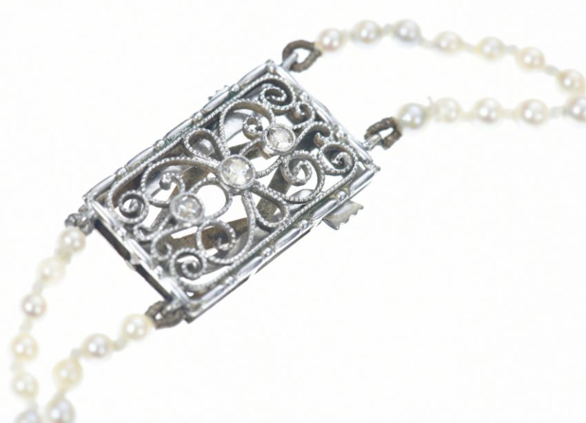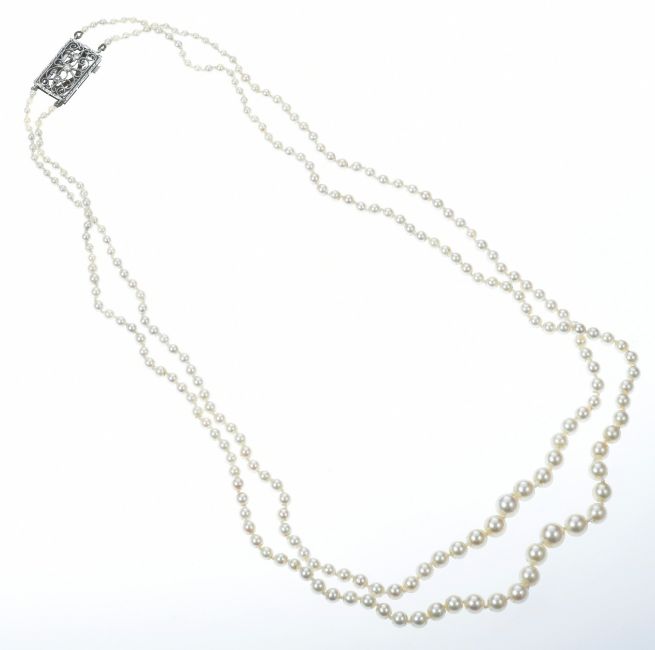 A double strand of cultured pearls with 9ct white gold clasp set with diamonds, 22.6g, 48cm