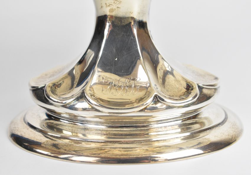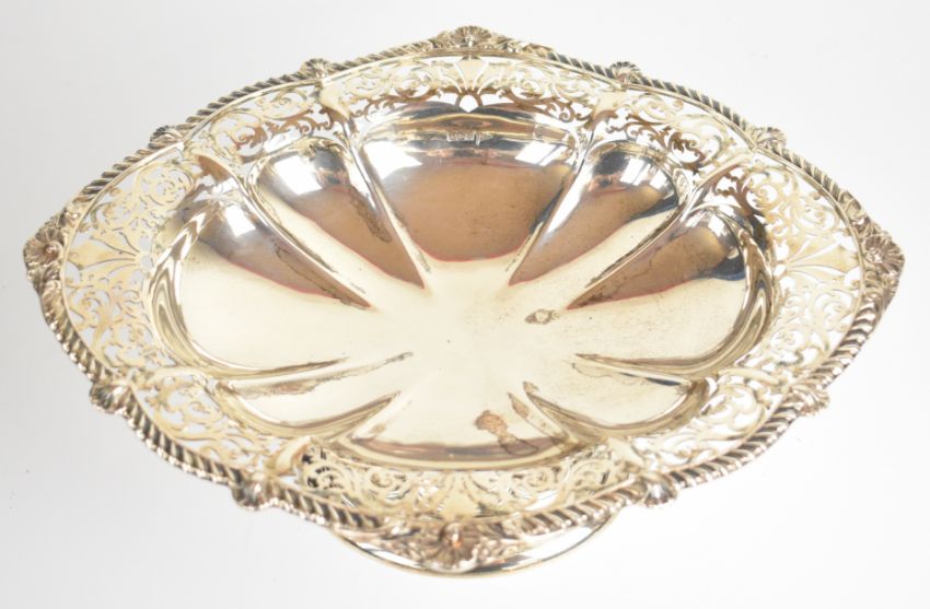 Walker & Hall Edward VII hallmarked silver centrepiece with gadrooned edge, lobed bowl and raised on a single lobed foot, Sheffield 1908, length 32cm, weight 768g