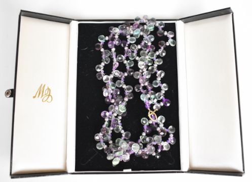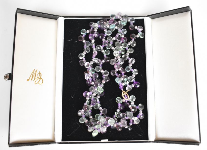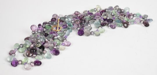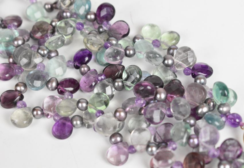 A beaded necklace made up of pearls, amethysts, fluorite and aquamarine, with 14k gold clasp
