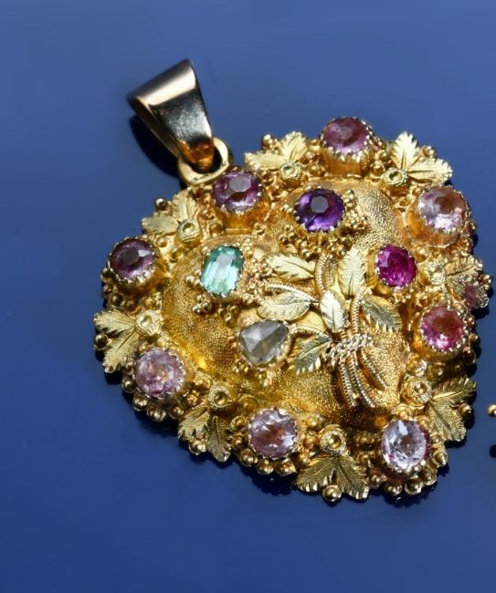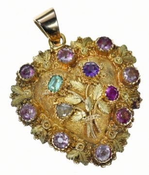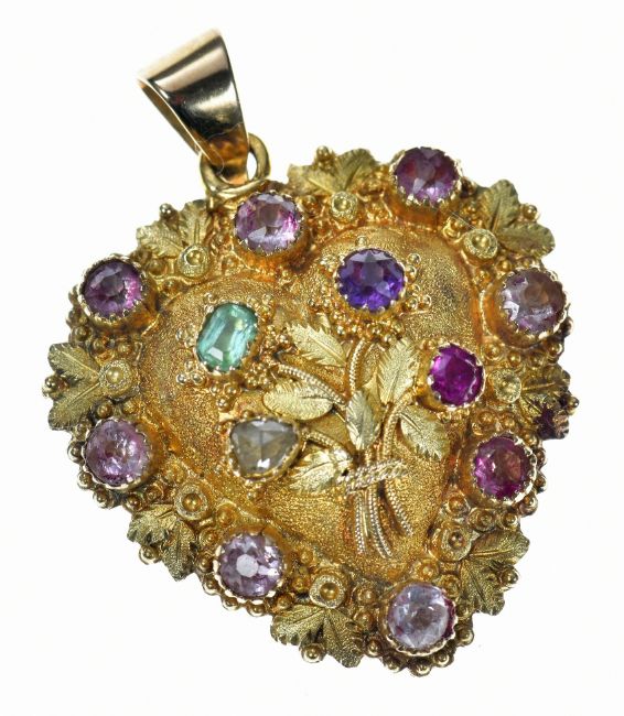 Georgian heart shaped pendant/ locket with applied floral and foliate decoration, set with a diamond, emerald, amethyst and ruby spelling 'dear' and with further amethysts to the border, 3.8g, 2.3 x 3cm (tests as 18k gold)