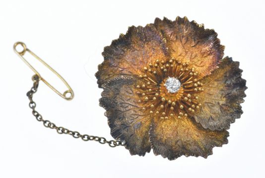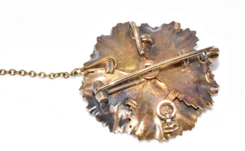 A yellow metal floral brooch/ pendant with textured matte finish set with an old cut diamond, 8.1g, 3cm (tests as 18ct gold)