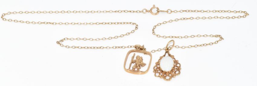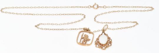 A 9ct gold St Christopher, 9ct gold pendant set with an opal and a 9ct gold chain, 3.7g